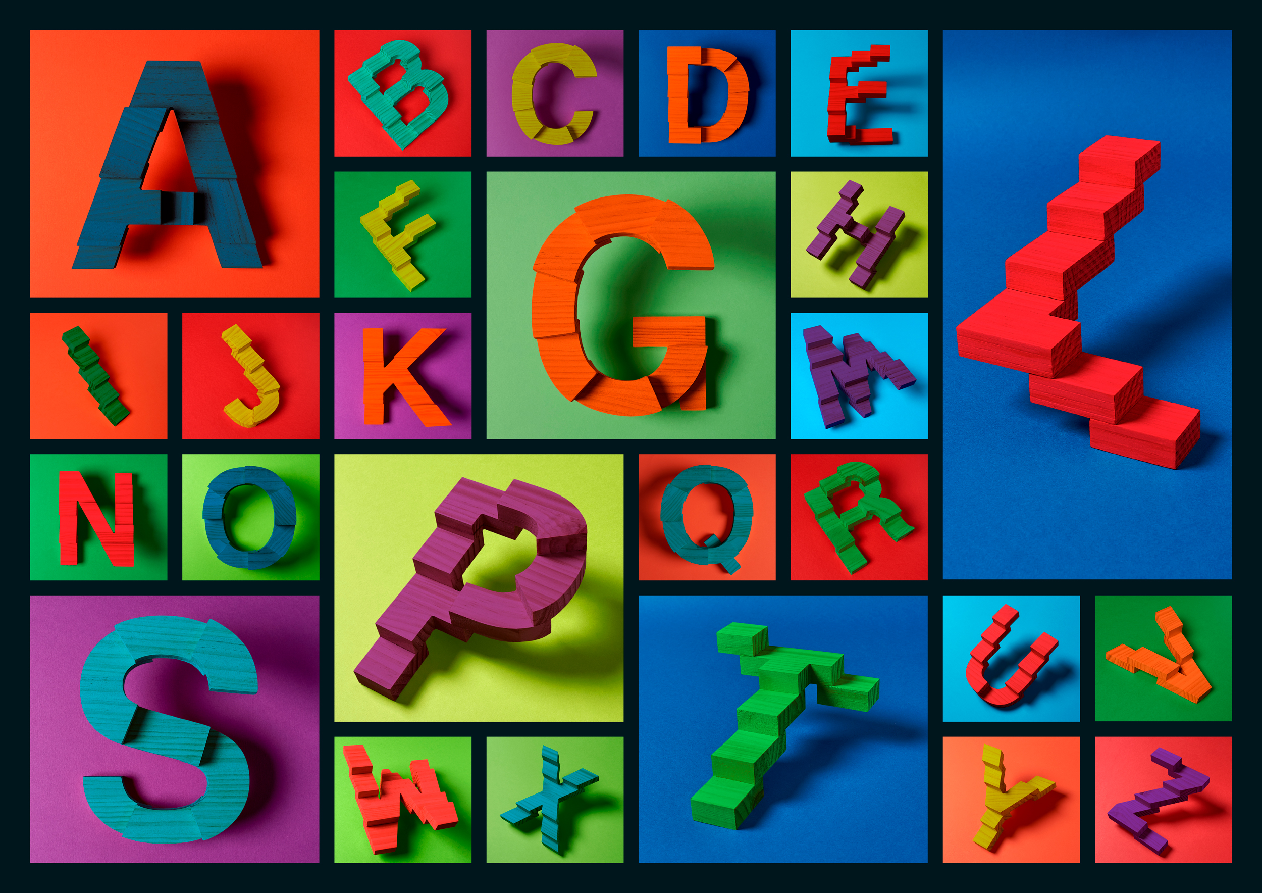 Play es una tipografía artesanal creada a partir de piezas de madera. Cada letra fue diseñada digitalmente y dividida entre 7 y 9 partes. Estas piezas se cortaron con una fresadora CNC, se lijaron y se ensamblaron manualmente hasta conformar cada letra.